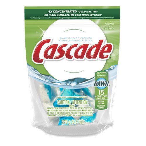 Cascade ActionPacs Dishwasher Detergent, Fresh Scent, 15-Count (Pack of 2) by Cascade is best for you4x Concentrated to clean better vs. regular Cascade dishwasher powder and gel recommended usage;The one pac with the Real Liquid Grease-Fighting Top;Powered by Cascade dishwasher detergent with the grease fighting power of Dawn;Dishwasher detergent rinses away residue, leaves dishes sparkling and clean;Our Shine Shield formula provides excellent shine for your dishes and glasses