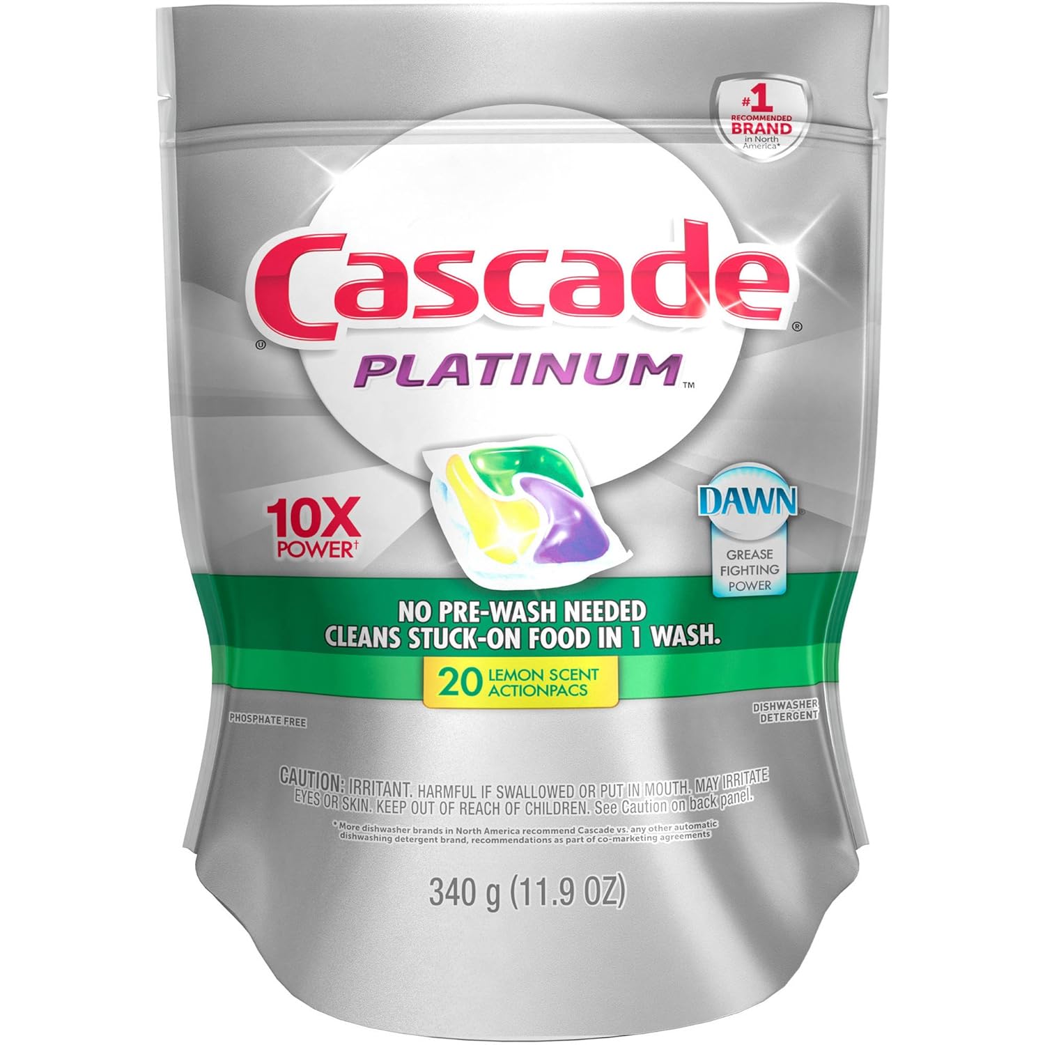 Cascade Platinum ActionPacs Kitchen Cleaner Dishwasher Detergent Lemon Burst, 20 count is best for youCascade Platinum ActionPacs clean stuck-on food in one wash, with no pre-wash needed. Plus, with 3X more* film-fighting power, they're our best clean for sparkling silverware and dishwasher. Premium tough food cleaning powers away stuck-on foods, while built-in rinse aid action and the grease-fighting power of Dawn make your dishes dazzle. Plus, it's formulated to help prevent hard-water filming--keeping your machine looking fresh and clean. Simply pop in an ActionPac and reveal a Platinum sparkle. *vs. the leading gel after 15 cycles in hard-water lab test Cascade Platinum ActionPacs Dishwasher Detergent Lemon Burst, 20 count: No pre-wash needed--cleans stuck-on food in one wash Cascade's best clean for sparkling silverware and dishwasher 3X more* film-fighting power ActionPacs are formulated with the grease-fighting power of Dawn Rinse aid action with Shine Shield formula rinses away residue and leaves brilliant shine Size: 23 pacs [13.7 oz (391 g)] Form: Tablets Model: 3700084469 Brand: Cascade Assembled Product Dimensions (L x W x H): 3.00 x 6.25 x 10.38 Inches