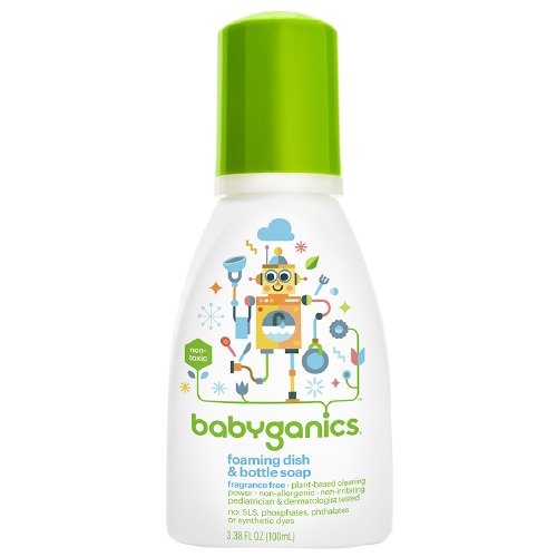 Babyganics Foaming Dish & Bottle Soap, Fragrance Free 3.38 oz is best for youOne tiny baby = 1 full sink of dishes and bottles. How does such a small baby create such a mound of dirty dishes? One of the eternal questions you ask as you stand at your sink. At least you won't question how to get squeaky clean sippy cups and bottles with no scary chemical or gel residue. Our innovative, foaming technology with dual cleaning agents saves time, needs less water for washing and rinses free. Whether it's baby, family or dinner party dishes (remember dinner parties?), this is the answer to one of your burning questions.