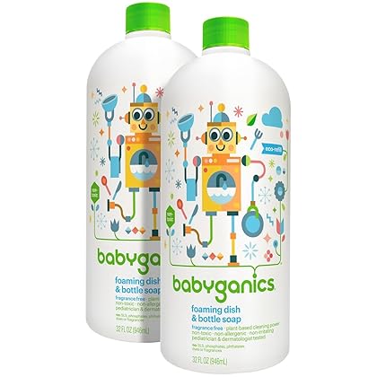Babyganics Foaming Dish & Bottle Soap - Fragrance Free - 32 fl oz - 2 pk is best for youHow does such a small baby create such a mound of dirty dishes? One of the eternal questions you ask as you stand at your sink. At least you won't question how to get squeaky clean sippy cups and bottles with no scary chemical or gel residue. Our innovative, foaming technology with dual cleaning agents saves time, needs less water for washing and rinses free. Whether it's baby, family or dinner party dishes (remember dinner parties?), this is the answer to one of your burning questions.