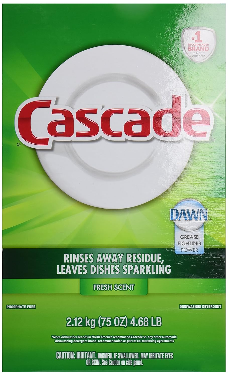 Pump bottle turns the liquid formula into powerful foam that absorbs, breaks down and removes grease from your dishes, pots and pans. Breakthrough foaming technology quickly absorbs 10-times more grease than regular dish cleaners so you use less water One pump is enough to clean an entire sink load of dishes; just squeeze your sponge to re-activate the foam; each bottle contains 190 pumpsthe Cascade Powder Dishwasher Detergent, Fresh Scent 75 Oz (Pack of 7) easy-to-use dishwasher packs give you the perfect amount of grease-fighting dishwasher detergent for a total clean the first time, leaving your dishes with a streak-free shine. Our enzyme-rich biodegradable formula powers away 48 hour stuck on food without chlorine, phosphates or synthetic fragrances. It's a convenient, no mess, no hassle, no measuring alternative to traditional powders and gels.Seventh Generation Lemon Dishwasher Detergent Gel makes effortless work of whatever is waiting in your dishwasher, without the use of phosphates or chlorine. This powerful plant-derived formula contains enzymes for greater cleaning power and is a USDA Certified Biobased formula of 96%. As always, the scents in our formula come from 100% essential oils & botanical extracts. For maximum effectiveness in hard water, use it with Seventh Generation Rinse Aid.Cascade Powder Dishwasher Detergent, Fresh Scent 75 Oz (Pack of 7) is best for youLeaves dishes sparkling view larger Get every mealtime off to a sparkling start with Cascade Powder dishwasher detergent. Featuring the trusted grease-fighting power of Dawn, Cascade Powder rinses away residue, leaving your dishes sparkling—and ready for your next mealtime masterpiece. For clean, shiny dishes, trust Cascade Powder dishwasher detergent. At a Glance Powers away greasy residue for sparkling dishes Powder with the grease-fighting power of Dawn Pure Rinse Formula rinses cleanly away Many Ways to Clean view larger Cascade is also available in Gel and convenient ActionPacs. Key Features view larger Trusted Formula Powers away greasy residue for sparkling dishes. view larger Dawn Power Formulated with the grease-fighting power of Dawn view larger Cascade Routine First, wash dishes with Cascade Powder for a sparkling clean. Then, to prevent spotting and filming on dishes, use Cascade Complete Rinse Aid. And to help clean limescale, grease, and odors away from your dishwasher, try Cascade Dishwasher Cleaner. view larger Also Try For a more convenient clean, try Cascade ActionPacs, Cascade Complete ActionPacs, and Cascade Platinum Pacs. Product Comparison Cascade Powder Cascade ActionPacs Cascade Complete ActionPacs Cascade Platinum Pacs Powers away greasy residue for sparkling dishes. Cleans a fully loaded dishwasher the first time around. Gets dishes completely clean, actually dissolving tough food particles. Advanced triple-action formula helps prevent residue on your dishes and filming on your machine. Grease-fighting power of Dawn ✓ ✓ ✓ ✓ Leaves dishes shining ✓ ✓ ✓ ✓ Eliminates need to prewash ✓ ✓ All-in-one cleaning action ✓ ✓ ✓ Convenient Pac form ✓ ✓ ✓ Cascade's best clean ✓ Frequently Asked Questions What temperature should my water be?You can wash your dishes in hot or cold water, since our products are formulated to perform in any water temperature. Try helping to save energy by washing in cold water. You’ll find you get a great clean, with less energy used. If you prefer to hand-wash using hot water, try Dawn Hand Renewal with Olay Beauty. What should I do if I have hard water?All of our dish products are designed to work effectively in all kinds of water hardness. Our dishwasher pacs, like Cascade All-in-1 Pacs, are formulated with water softeners to help fight hard-water deposits on your dishes and—as always—are the perfect dose. Is there a correct way to load the dishwasher?When you’re loading your dishwasher, it helps to put dishes in the best position for cleaning. Load all dirty dishes so they’re separated and facing the center, and always put plastic items on the top rack of the dishwasher. You can begin by placing large platters, cookie sheets, baking dishes, and pans around the perimeter of the bottom drawer. Next, add your plates. Stagger large dinner plates and smaller salad plates to give each dish more exposure. Set large and medium-size bowls in the remaining space in a slanted or completely downward position for optimal cleaning. Place dirty silverware in the cutlery container.To organize the top drawer, line downward-facing glasses and mugs along the outer edges. Add bowls and extra-small saucers to the center section, placing each on a slant to create extra space. As a rule, the bottom drawer of your dishwasher is exposed to more heat than the top, so place plastic items on the higher drawer to avoid melting and warping. Gently nest stemware along the left-hand side—many dishwashers feature a protective holder for these items. Be sure to check the height of your stemware before closing the drawer to avoid broken glass! In the small pockets of space between your top-drawer dishes, lay long, slender items like tongs and spatulas. Last, be sure no items block the sprayer arms, which can prevent water from reaching all of your dishes. How do I ensure my dishes dry properly in the dishwasher?Use a rinse aid, which is designed to ensure dishes dry properly in your dishwasher. Cascade Rinse Aid is specifically formulated to give you outstanding spot and film protection along with amazing shine. Our rinse aid helps to rinse away food particles and residues that can cause spots on dishes. Load the dishwasher so that all items are properly tilted for good drainage. Avoid nesting of dishes and silverware by staggering shapes and sizes and placing utensil handles both upward and downward. If available, use the 'heat dry' option.