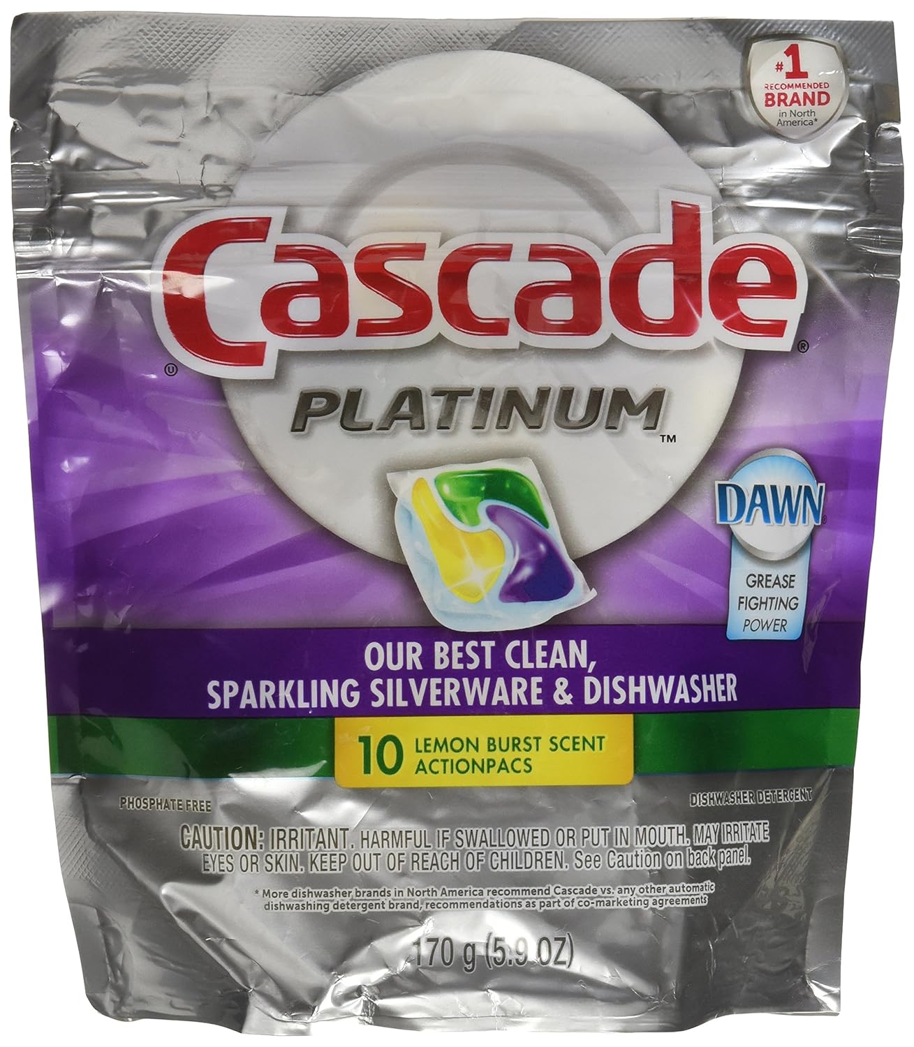 Pump bottle turns the liquid formula into powerful foam that absorbs, breaks down and removes grease from your dishes, pots and pans. Breakthrough foaming technology quickly absorbs 10-times more grease than regular dish cleaners so you use less water One pump is enough to clean an entire sink load of dishes; just squeeze your sponge to re-activate the foam; each bottle contains 190 pumpsthe Cascade Platinum Actionpacs Lemon Burst Scent Dishwasher Detergent 10 Count easy-to-use dishwasher packs give you the perfect amount of grease-fighting dishwasher detergent for a total clean the first time, leaving your dishes with a streak-free shine. Our enzyme-rich biodegradable formula powers away 48 hour stuck on food without chlorine, phosphates or synthetic fragrances. It's a convenient, no mess, no hassle, no measuring alternative to traditional powders and gels.Seventh Generation Lemon Dishwasher Detergent Gel makes effortless work of whatever is waiting in your dishwasher, without the use of phosphates or chlorine. This powerful plant-derived formula contains enzymes for greater cleaning power and is a USDA Certified Biobased formula of 96%. As always, the scents in our formula come from 100% essential oils & botanical extracts. For maximum effectiveness in hard water, use it with Seventh Generation Rinse Aid.Cascade Platinum Actionpacs Lemon Burst Scent Dishwasher Detergent 10 Count is best for youOur ultimate clean for dishes, and even helps keep dishwashers sparkling view larger Formulated with the grease-fighting power of Dawn. Help keep your dishes and clean dishwasher sparkling in one simple step. Meet Cascade Platinum—our ultimate clean for dishes, with the added power to help prevent hard water filming inside your machine. Superior tough food cleaning powers away stuck-on foods, while built-in rinse aid action plus the grease fighting power of Dawn work together to keep your dishes dazzling. Simply pop in an ActionPac and reveal dishes with a Platinum sparkle. 3 Steps to Your Perfect Clean view larger For a virtually no-fail clean, try Cascade’s ultimate dish routine. Cascade Platinum – Use every wash for a brilliant clean that even helps keep your dishwasher sparkling. Cascade Complete Rinse Aid – Fill your dishwasher’s rinse aid dispenser and refill as needed. Cascade Dishwasher Cleaner – Use once per month. Beyond Detergent view larger Secret ingredients for added shine, protection & performance. Cascade Rinse Aid – Protects glassware from spots and filming and delivers a dazzling dose of shine. Cascade Dishwasher Cleaner – Easy-to-use pacs help remove limescale buildup, grease, and odors lurking in your dishwasher. Frequently Asked Questions How much Cascade detergent should I use in my dishwasher?For Cascade powder and gel detergents, start by trying the recommended amount on the back label. There may be times when it’s necessary to use a little more or less, depending on your dish load and water hardness. For something even simpler, try Cascade ActionPacs. Each pac provides the perfect dose of clean, so you know exactly how much to use, every time. How do ActionPacs work?Cascade, Cascade Complete, and Cascade Platinum ActionPacs make dishwashing even simpler by taking out the guesswork. They’re easy to use because they require no measuring, unwrapping, crumbling, or cleanup. ActionPacs contain a higher concentration of detergents than powders and gels, plus built-in rinse and shine ingredients. To use, simply pop an ActionPac into your dishwasher’s detergent cup, close the cup lid, and let your dishwasher run. My dishwasher manual says to fill both cups with detergent. Do I need to use two ActionPacs?Nope. You only need one ActionPac because the formula is concentrated. They’re designed to give you a convenient, simple way to dose detergent with no premeasuring. Do I need to pre-rinse my dishes?Actually, with Cascade Complete powder, gel, and ActionPacs, and Cascade Platinum ActionPacs, you can skip the pre-scrub and load your dishes in right off the table. These formulas contain advanced cleaning and rinsing power, so pre-rinsing isn’t necessary. What if I have hard water?Water hardness varies depending on where you live. The good news is all of our ActionPacs are formulated with water softeners to help fight hard water deposits on your dishes. How can I prevent filming on my glasses and dishware?Here are some simple steps you can take to help keep your glasses film-free: Fill both detergent cups for each load (if you’re using Cascade ActionPacs, you only need to use one). Try using Cascade Rinse Aid, which protects surfaces and boosts drying to prevent spots and streaks. Dishwasher water temperature should be at least 120 degrees Fahrenheit. Try running hot water at the kitchen sink before starting the load to help reach this temperature. To help prevent low water pressure, make sure that no other water is being used in the house (showers, grass watering, washing machine, etc.). Be sure the dishwasher is loaded so that no items block the sprayer arms and prevent adequate water from reaching all the dishes. Once a month, use Cascade Dishwasher Cleaner to help remove limescale, grease, and odor buildup that can contribute to spotting and filming. Product Comparison Cascade Platinum Cascade Complete Cascade Our ultimate clean for dishes, and even helps keep dishwasher sparkling. Powers away 24-hour stuck-on food—no pre-rinse needed. Rinses away residue to leave dishes sparkling. Grease-Fighting Power of Dawn ✓ ✓ ✓ Fights Tea & Coffee Stains ✓ ✓ ✓ Brilliant Shine ✓ ✓ ✓ Virtually Spotless Dishes Best Best Better Tough Food Enzyme Action Best Better Good Our Best Film Prevention for Sparkling Machine ✓
